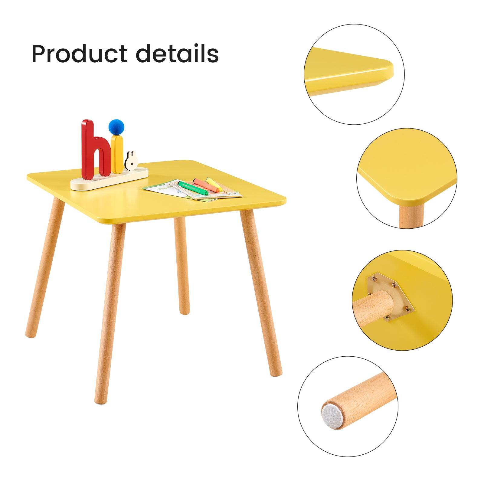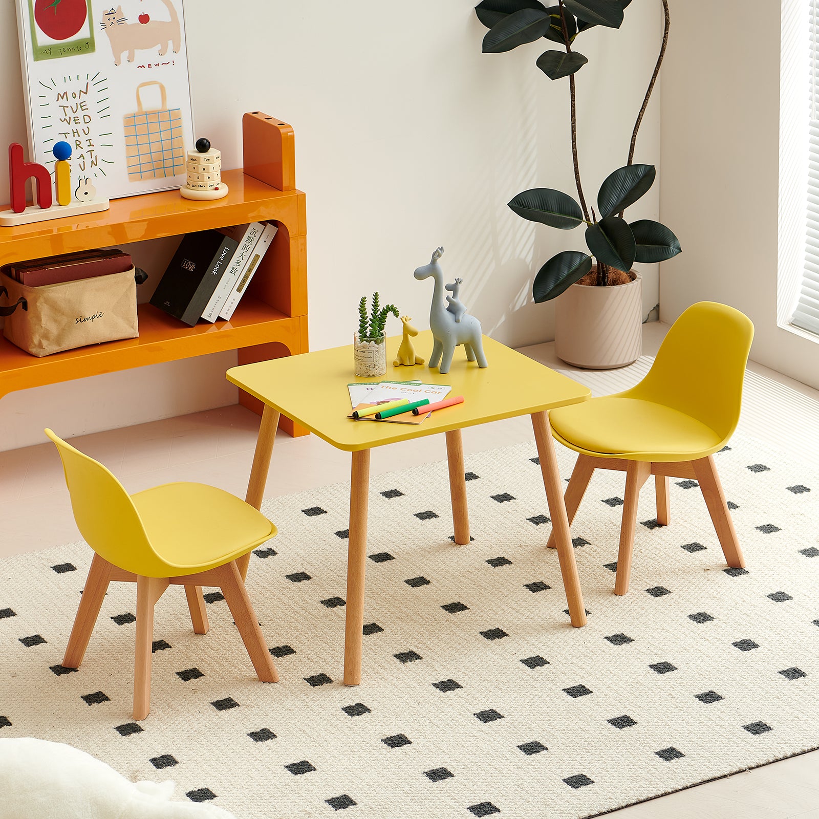 Dieses supersüße Kindertisch- und Stuhlset umfasst 2 süße Stühle und 1 stabilen Tisch, der für Kinder im Alter von 3 bis 5 Jahren konzipiert ist. Tisch und Stühle bestehen aus hochwertigen Buchenholzbeinen, die robust und langlebig sind, um den Aktivitäten und dem Spiel der Kinder standzuhalten. Die Gesamtfarbe ist ein kräftiges und fröhliches Gelb, genau wie die Sonne, warm und hell, was die Essenszeit des Babys sofort erhellen kann.