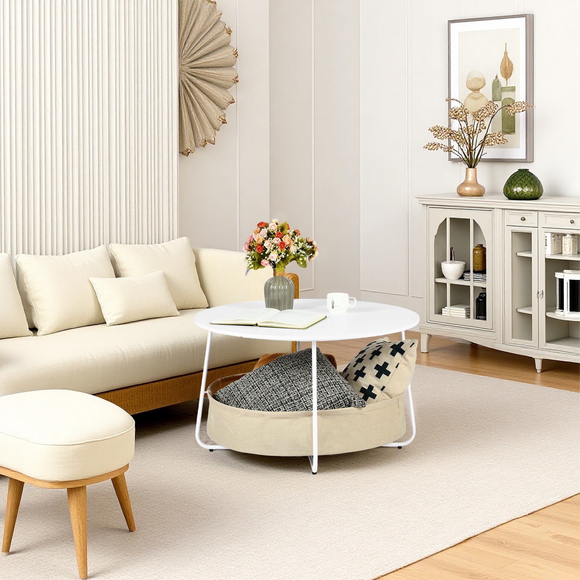 Dieser runde Couchtisch zeichnet sich durch klare Linien und eine elegante Kombination aus Weiß und Beige aus, die Ihrem Wohnzimmer oder Büro einen modernen Touch verleiht. Sein stilvolles Erscheinungsbild harmoniert nahtlos mit verschiedenen Möbel- und Einrichtungsstilen, von modern bis minimalistisch.