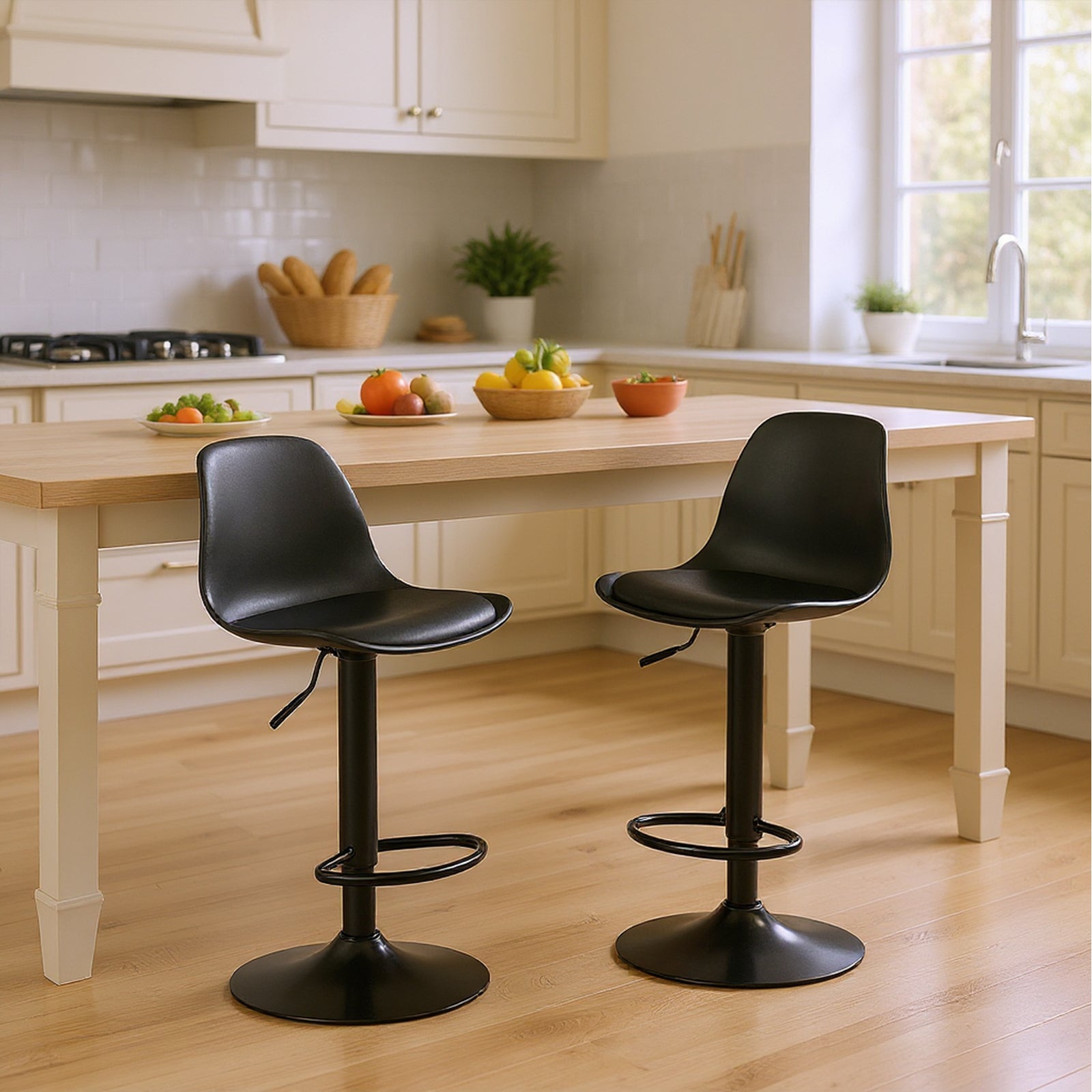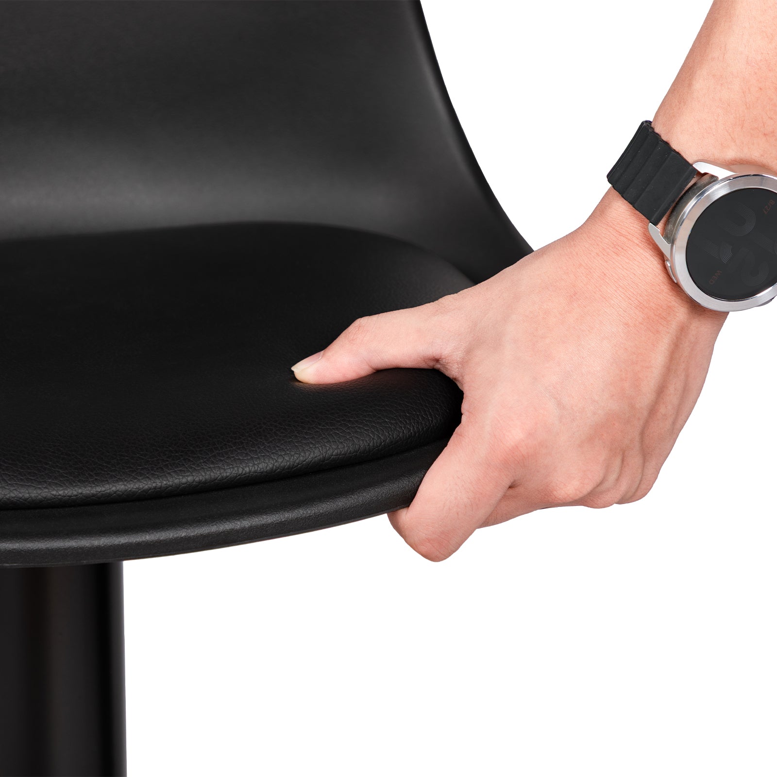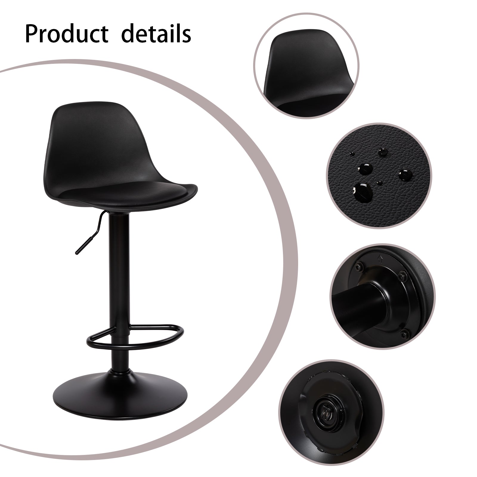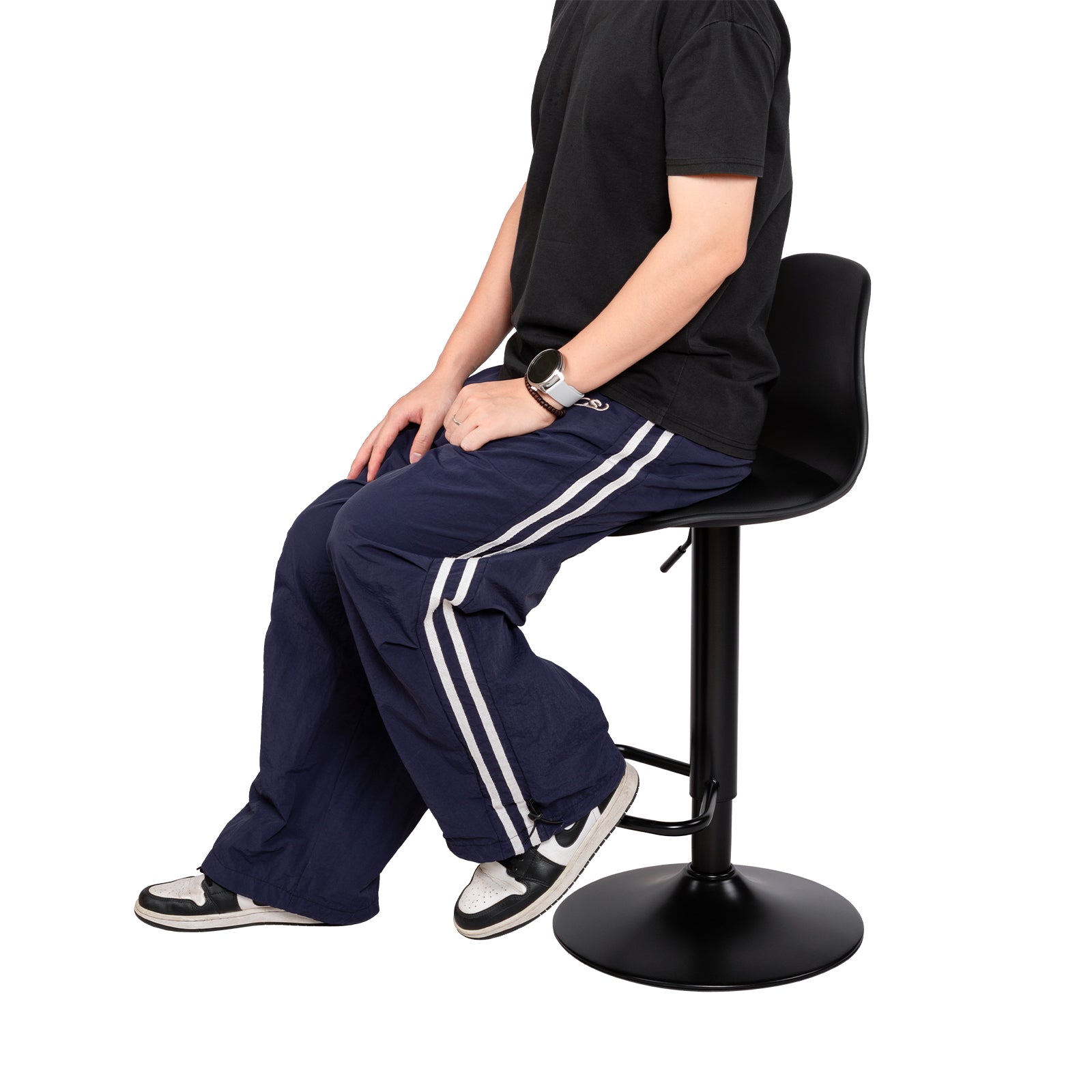 Höhenverstellbar: Das Gaslift-Design ermöglicht eine mühelose Höhenverstellung mit einem Bereich von 20 cm. Die Gesamthöhe des Hockers beträgt zwischen 80,5 cm und 103 cm und passt perfekt zu Kücheninseln, Bar-Tresen und Esstischen.