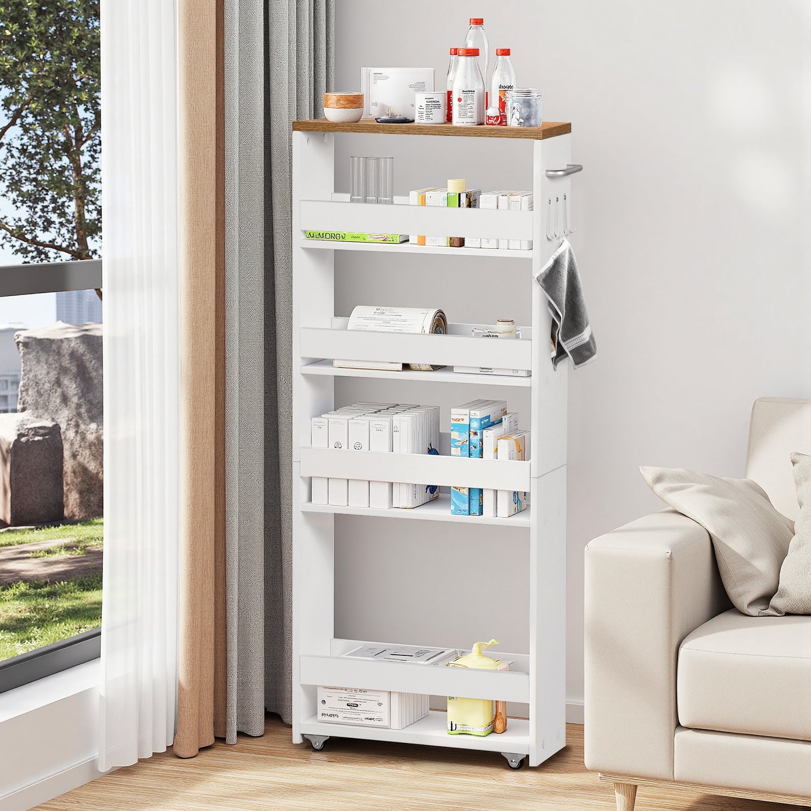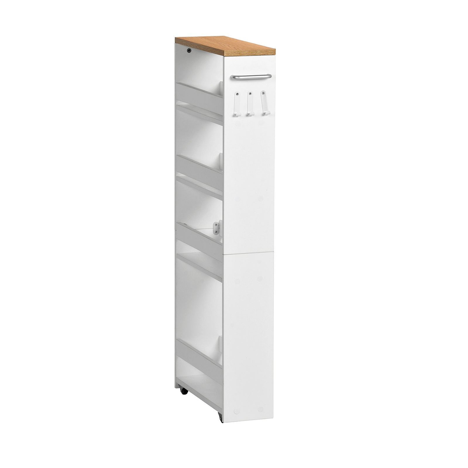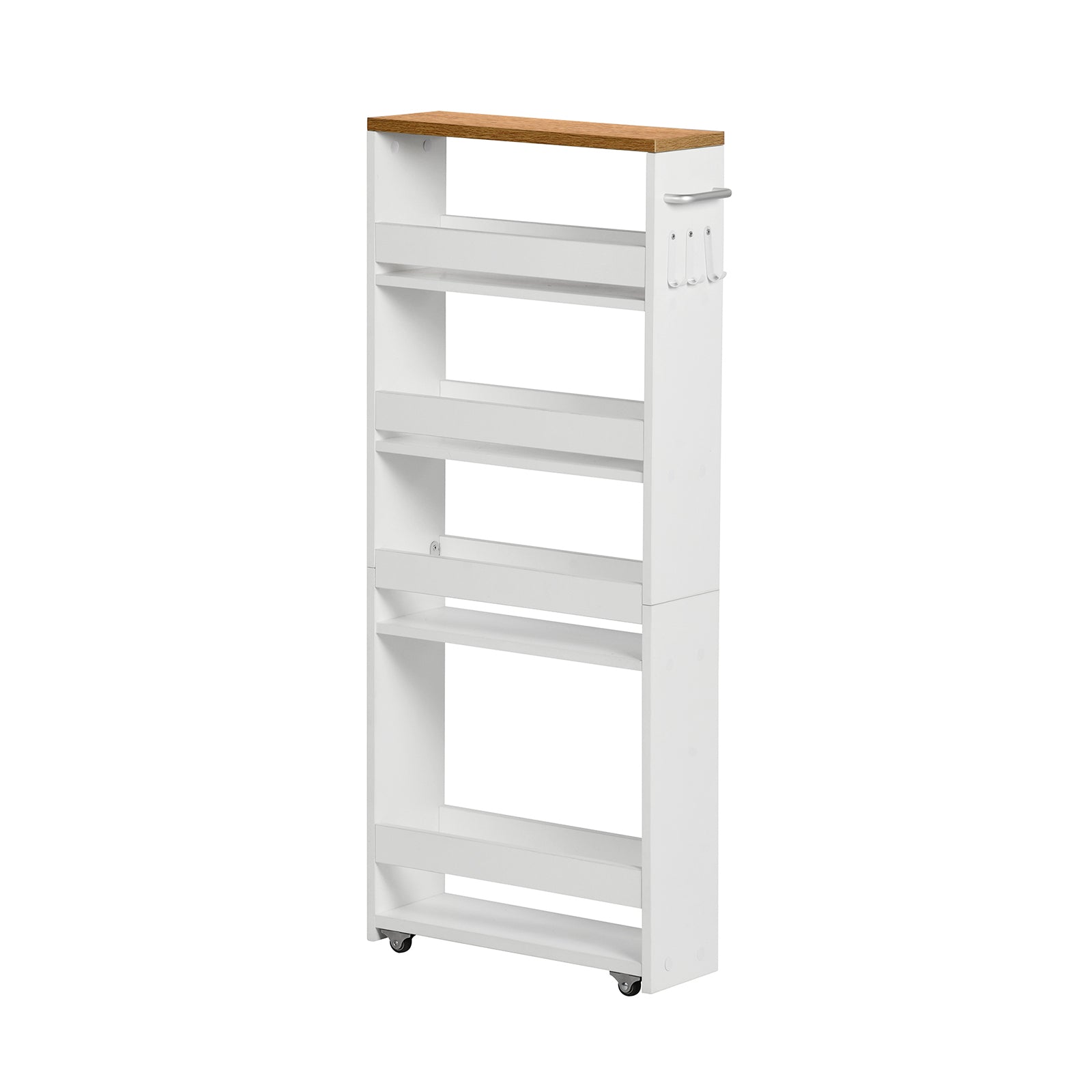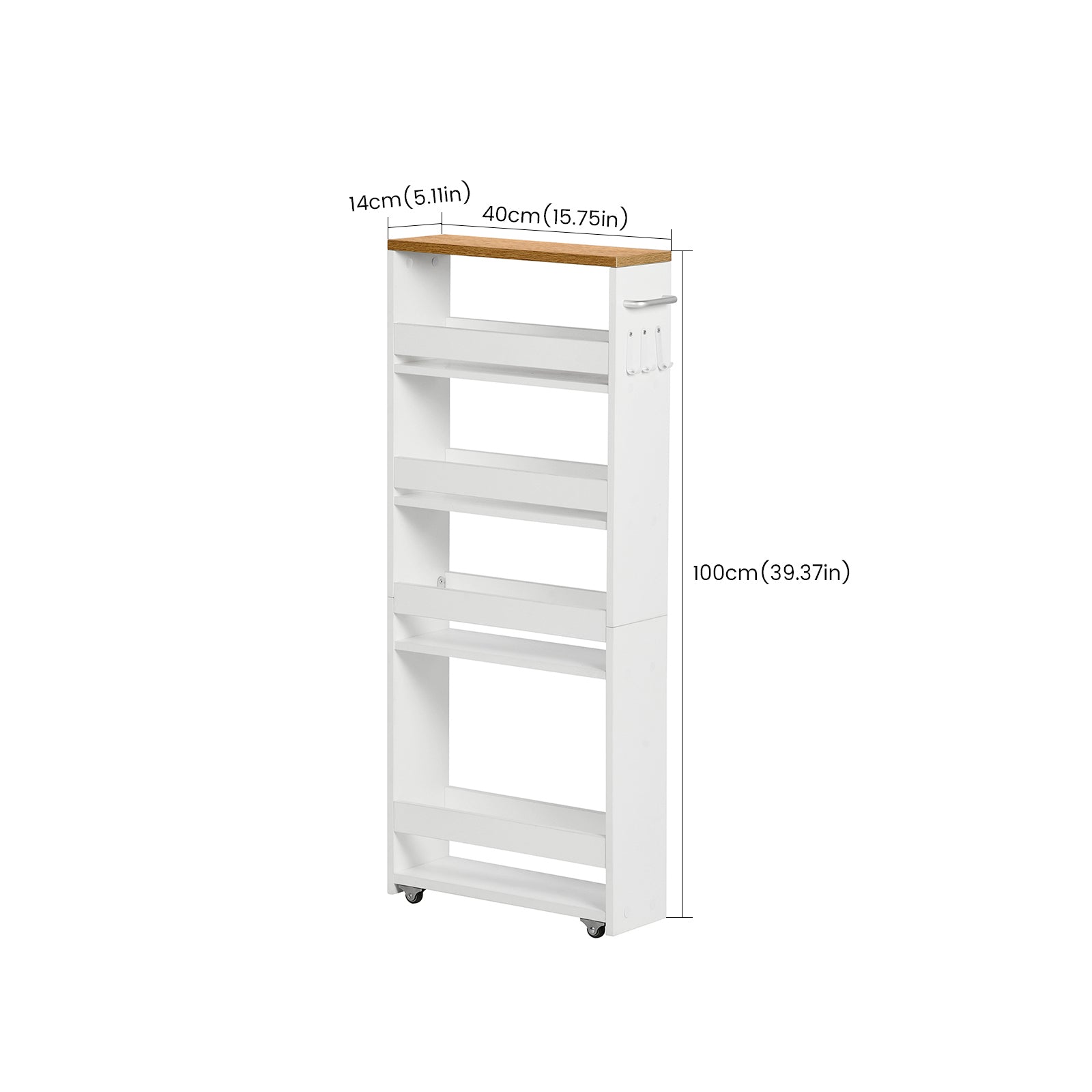 Dieser 4-stöckige Aufbewahrungswagen wurde entwickelt, um enge, schwer zugängliche Bereiche optimal zu nutzen und sie in übersichtliche Aufbewahrungsbereiche zu verwandeln. Dank seines schlanken Profils und der vier robusten Räder lässt sich der Wagen mühelos überall hin bewegen – egal ob in Küche, Bad oder Wohnzimmer. Er eignet sich perfekt für enge Räume, wie zum Beispiel den Zwischenraum zwischen Kühlschrank und Schränken.
