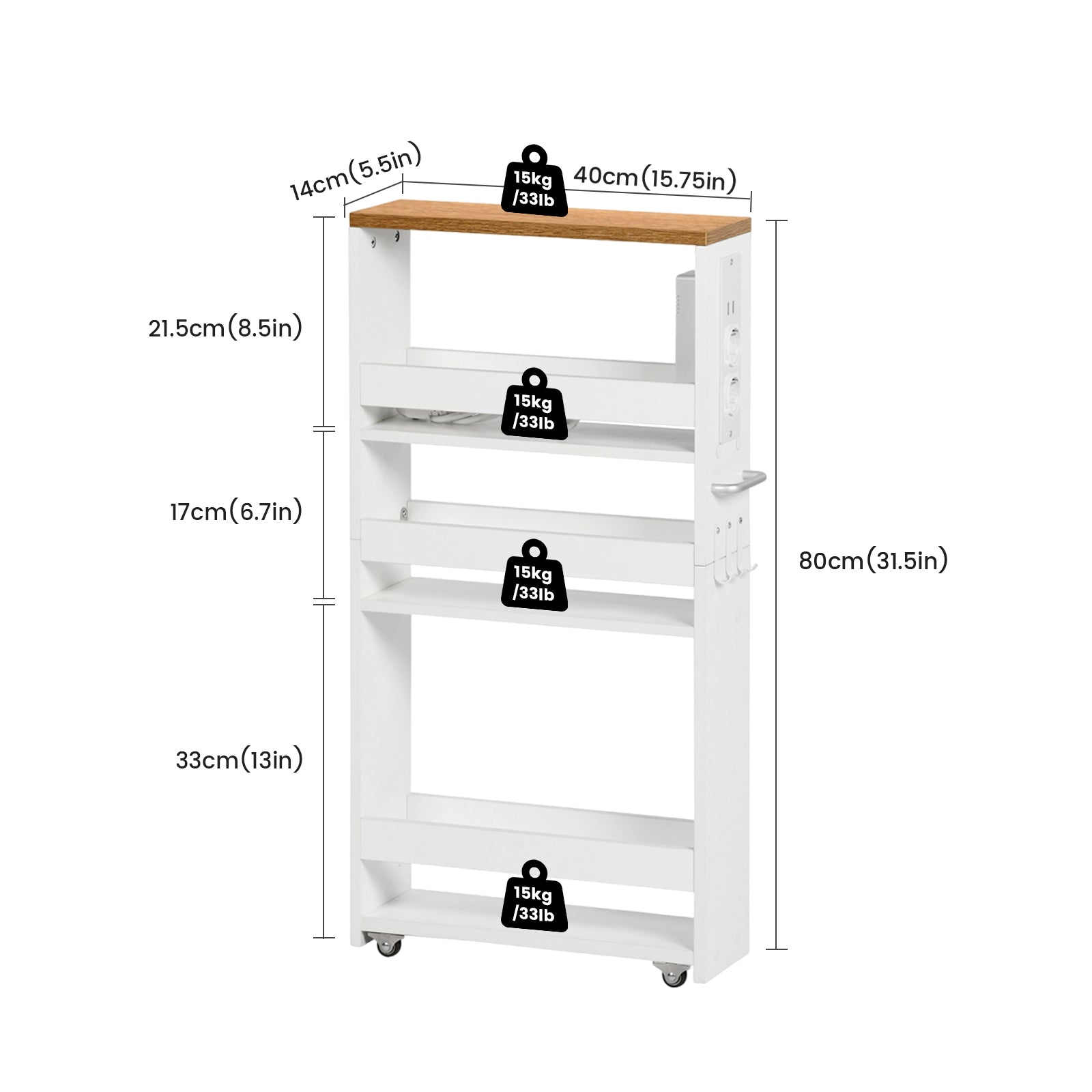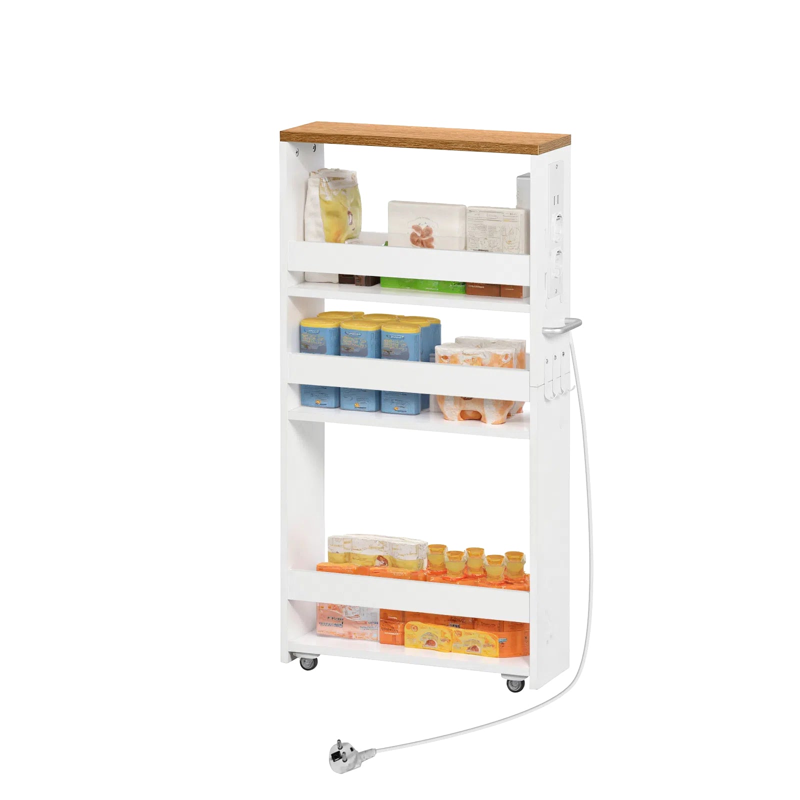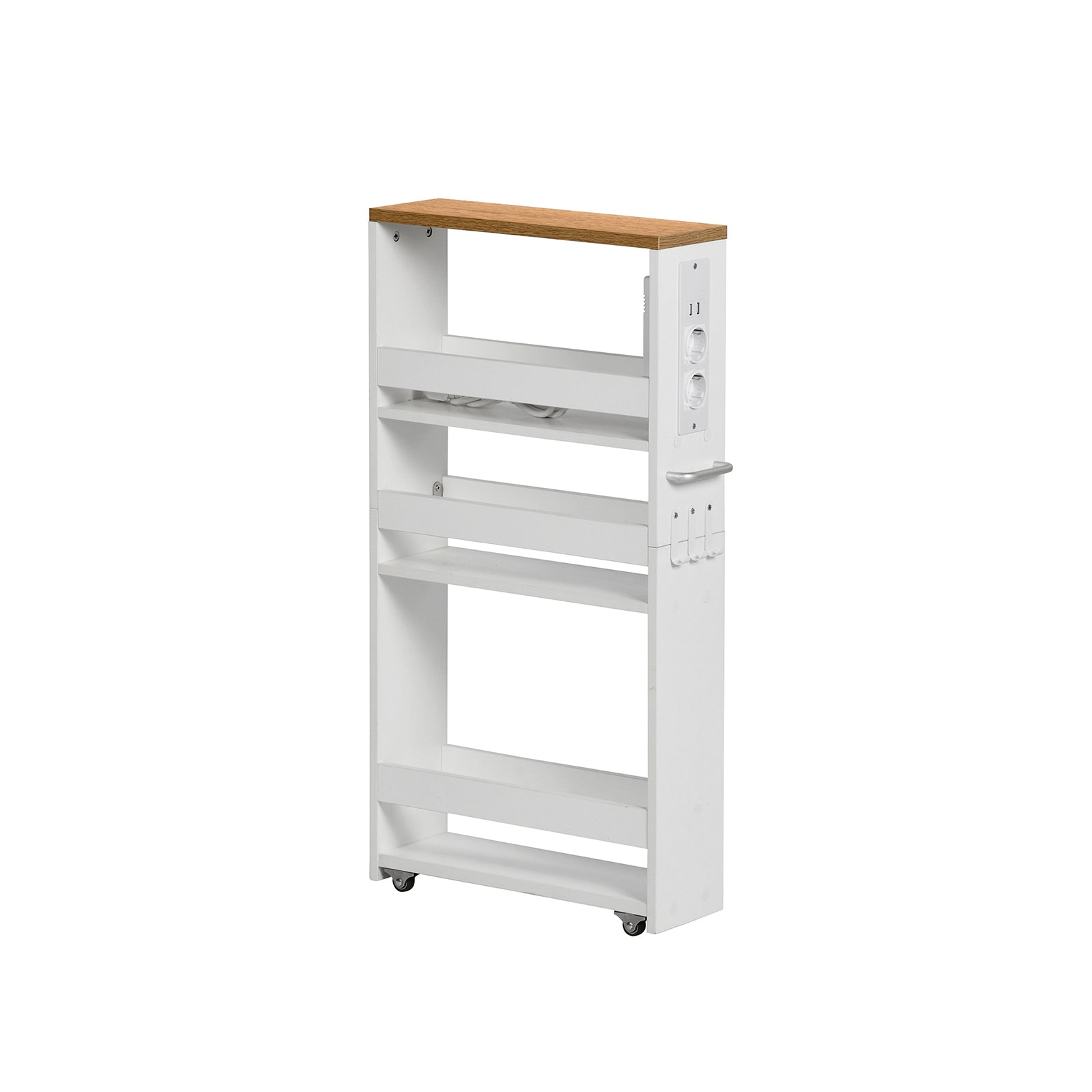 Dieser 4-stöckige Aufbewahrungswagen ist für enge Räume konzipiert und verwandelt Küchen, Bäder und andere kompakte Bereiche mühelos in übersichtliche und aufgeräumte Bereiche. Dank der vier drehbaren Rollen lässt er sich mühelos in jede Position bewegen, sodass Sie schnell auf Ihre Gegenstände zugreifen können. Die integrierte Steckdosenleiste sorgt für zusätzlichen Komfort. Er passt perfekt neben Küchenschränke, Kühlschränke oder in andere schmale Bereiche und nutzt so den verfügbaren Platz optimal aus.