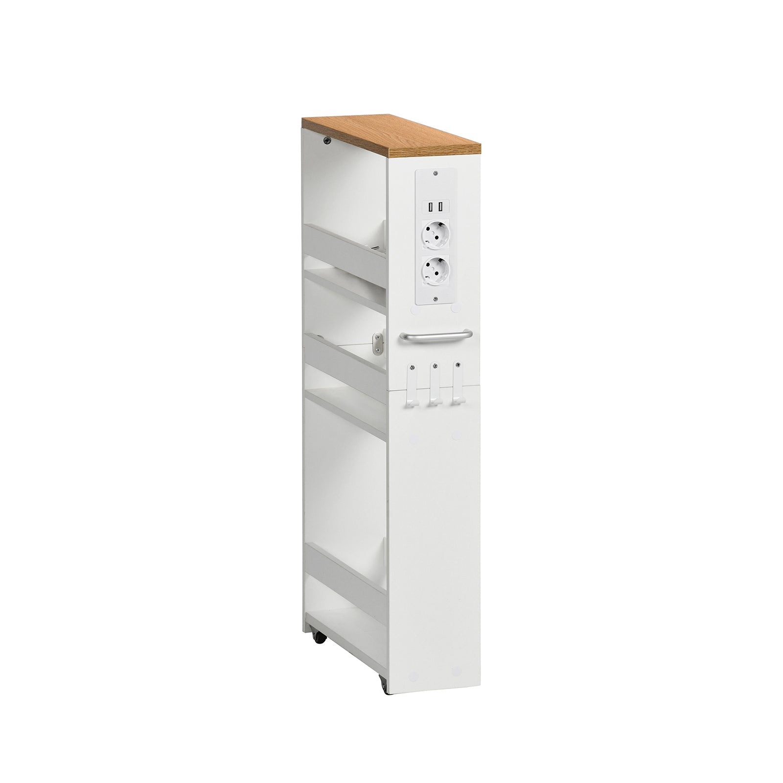 Dieser weiße Aufbewahrungswagen mit vier Etagen ist nicht nur praktisch, sondern auch stilvoll. Die integrierte Steckdosenleiste verleiht Ihrer Küche oder Ihrem Bad einen modernen Touch. Er ist ein Must-have für jeden Haushalt und bietet Funktionalität und Ästhetik zugleich.